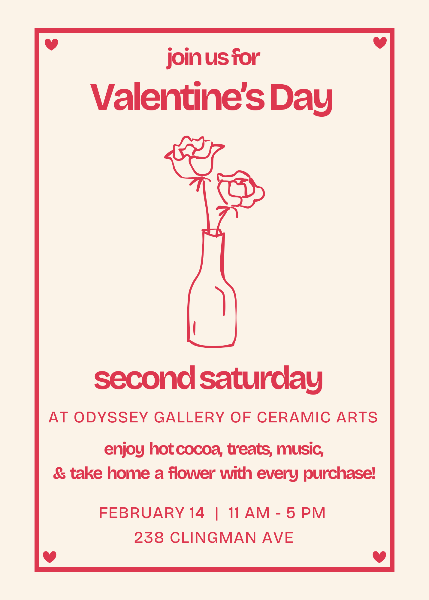Love is in the air at Odyssey Gallery of Ceramic Arts this Valentine’s Day! Come warm up with a cup of hot cocoa, enjoy treats, talk with artists, and listen to music. Come by and get a special handmade ceramic gift for your sweetheart. We will be giving out a flower for you to take home with each purchase!!